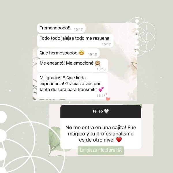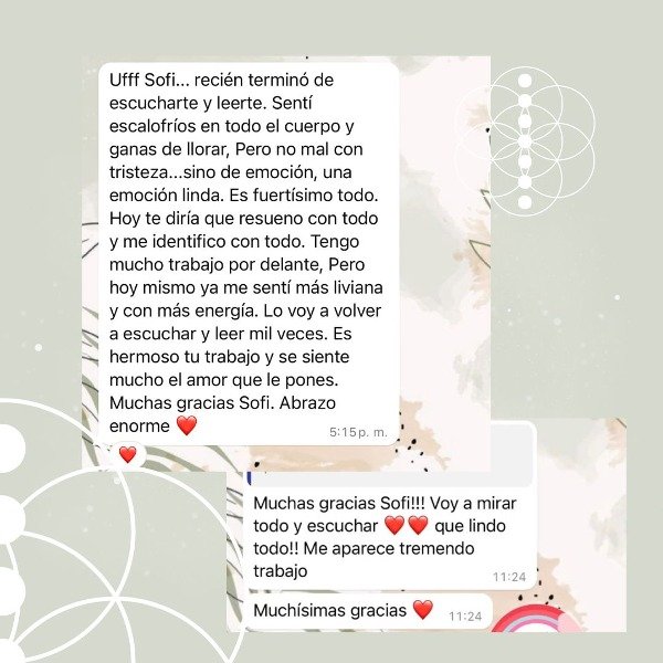 Todo es a distancia y asincrónico, es decir que no nos conectamos, envío el chequeo y la limpieza en PDF y la canalización en audio para que te quede el material completo, y luego hago el acompañamiento de lo que surja o necesites.